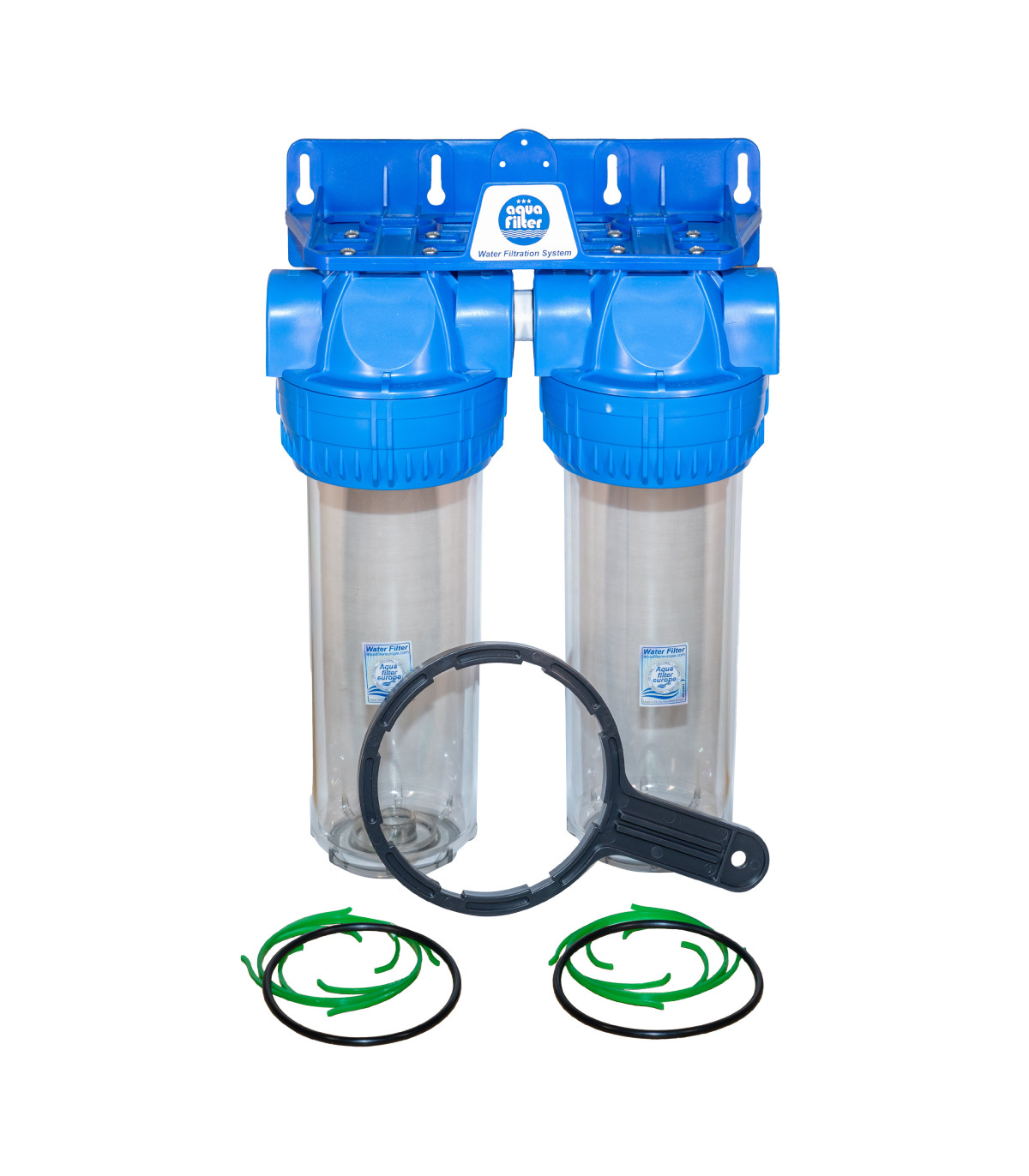 Dwustopniowa stacja filtracyjna oparta na dwóch korpusach trzyczęściowych z przezroczystymi kloszami o standardzie wymiarowym 10″ z przyłączami ½”, połączonych szeregowo, przeznaczona do montażu w instalacjach wody zimnej w mieszkaniach lub małych domach. Stacja dedykowana jest jako pierwsza linia filtrowania — np. do usuwania zawiesin, mułu, piasku, rdzy — oraz jako baza do dalszego uzdatniania wody (wkłady węglowe, zmiękczające lub odżelaziające).