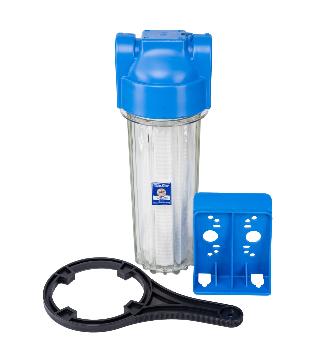 Obudowa narurowa dwuczęściowa w standardzie rozmiarowym 10″ to kompletne rozwiązanie do montażu wkładów filtracyjnych o wysokości 10 cali i średnicy 2,5″ w instalacjach domowych za pomocą przyłącza 1”. Produkt dostarczany jest jako zestaw: korpus z przeźroczystym kloszem, głowica z odpowietrznikiem, płytka montażowa, klucz serwisowy oraz bakteriostatyczny dysk centrujący.