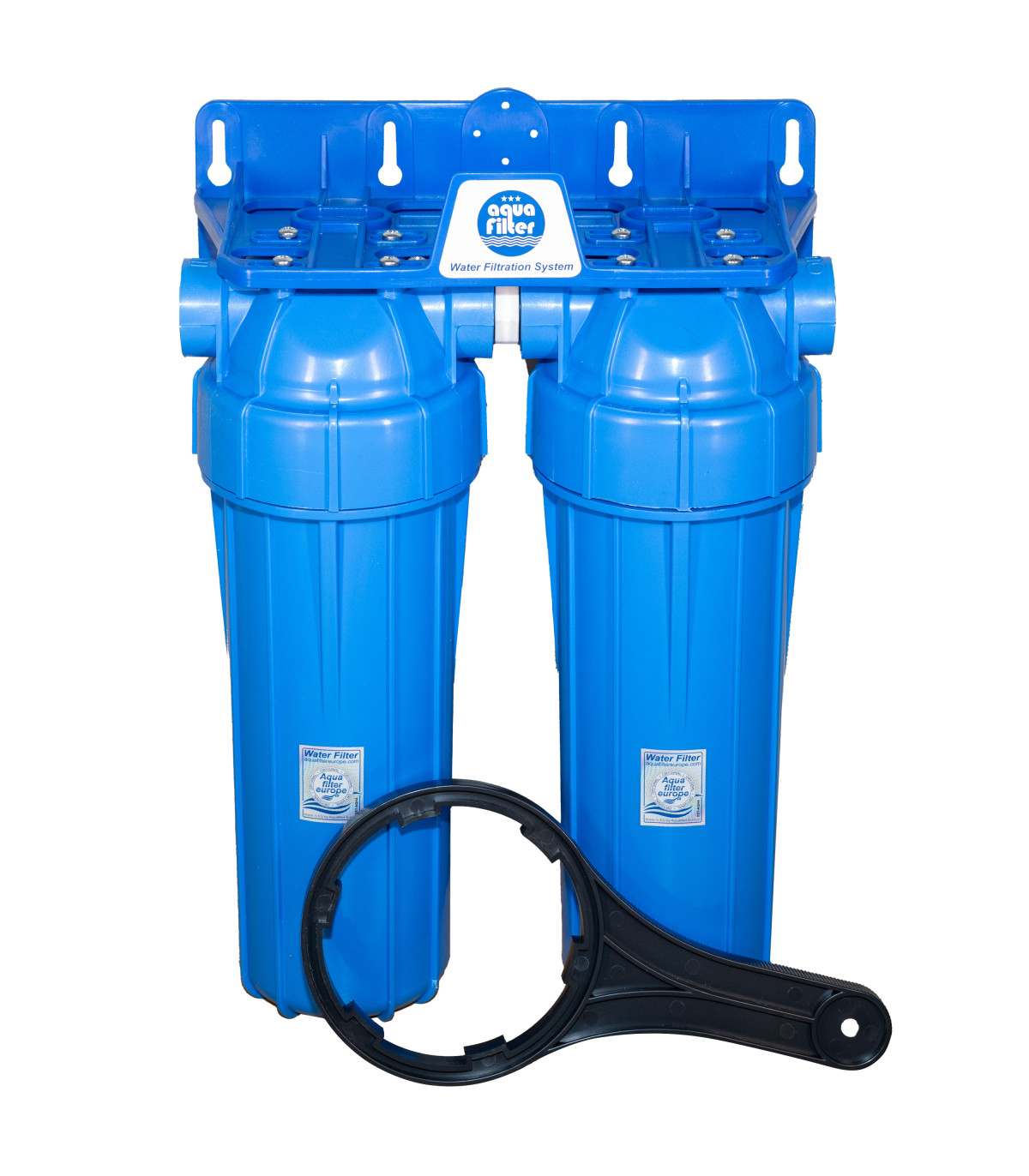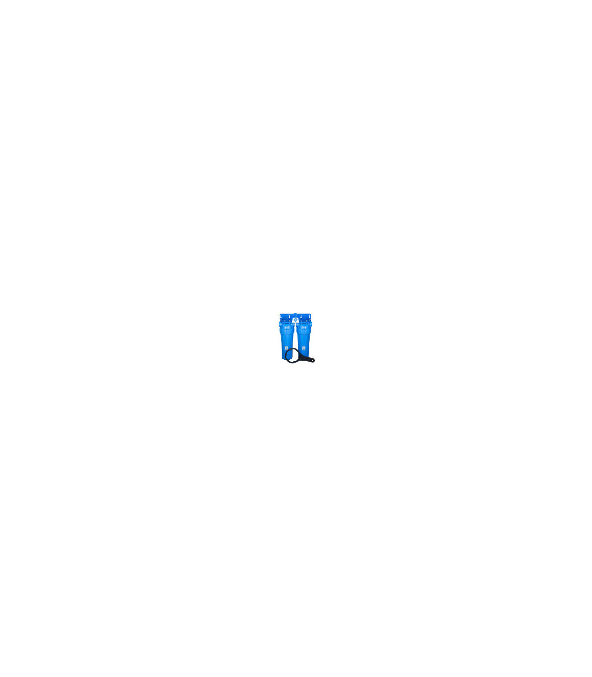 Dwustopniowa stacja filtracyjna oparta na dwóch korpusach dwuczęściowych z nieprzezroczystymi kloszami o standardzie wymiarowym 10″ z przyłączami ½”, połączonych szeregowo, przeznaczona do montażu w instalacjach wody zimnej w mieszkaniach lub małych domach. Stacja dedykowana jest jako pierwsza linia filtrowania — np. do usuwania zawiesin, mułu, piasku, rdzy — oraz jako baza do dalszego uzdatniania wody (wkłady węglowe, zmiękczające lub odżelaziające).