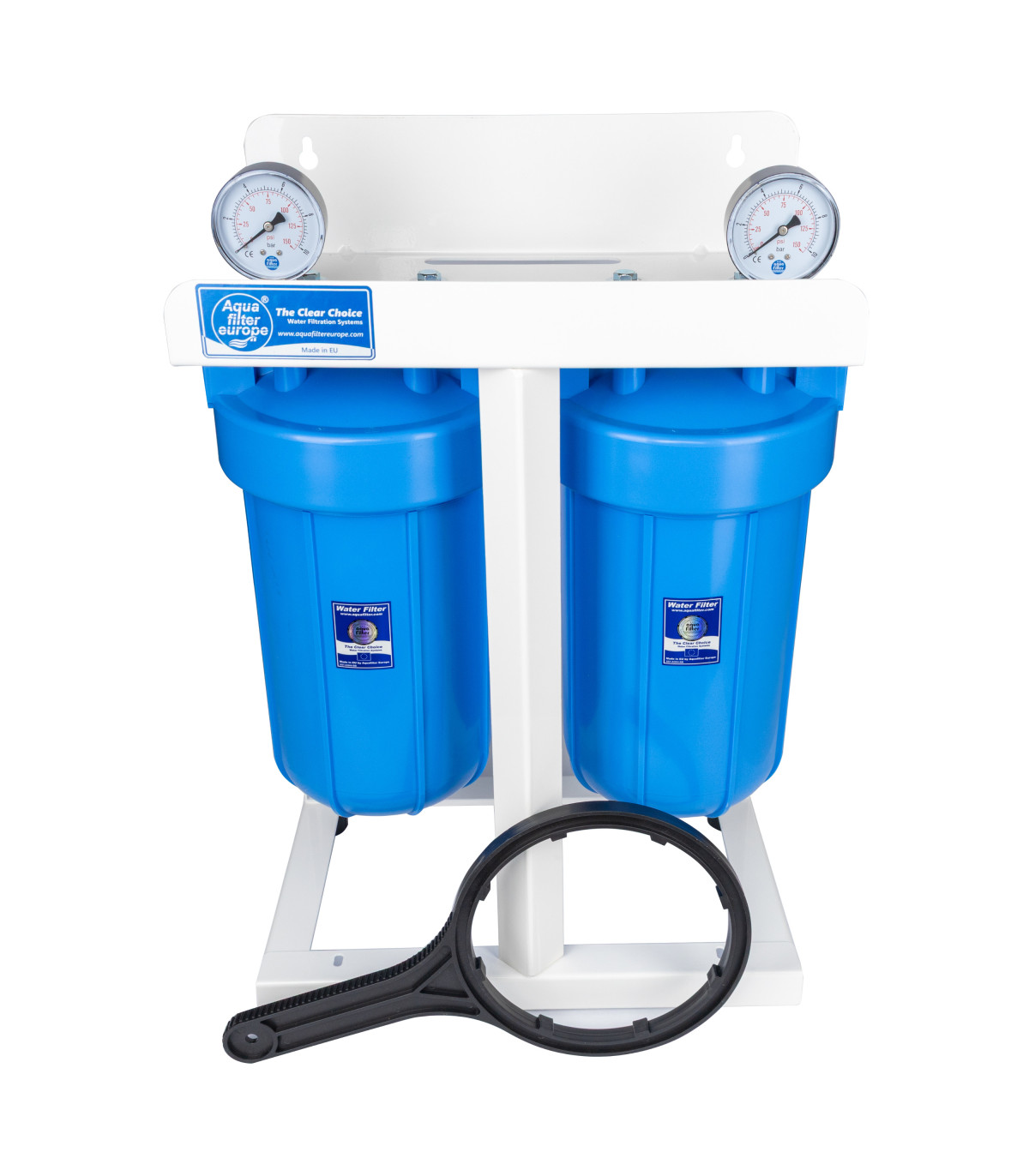 Dwustopniowy system filtracyjny oparty na standardzie Big Blue 10″ z przyłączem 1”, zaprojektowany do pracy na głównym przyłączu wody w domu lub mieszkaniu, a także w instalacjach przemysłowych. Bazuje na konfiguracji z dwoma korpusami Big Blue 10″ zamocowanymi na metalowym stelażu, wyposażonymi w manometry, odpowietrzniki, i komplet przyłączy instalacyjnych. System ten pozwala na elastyczne dopasowanie wkładów filtracyjnych do potrzeb wody w instalacji (np. sedymentacja, węgiel aktywny, wkłady zmiękczające).
