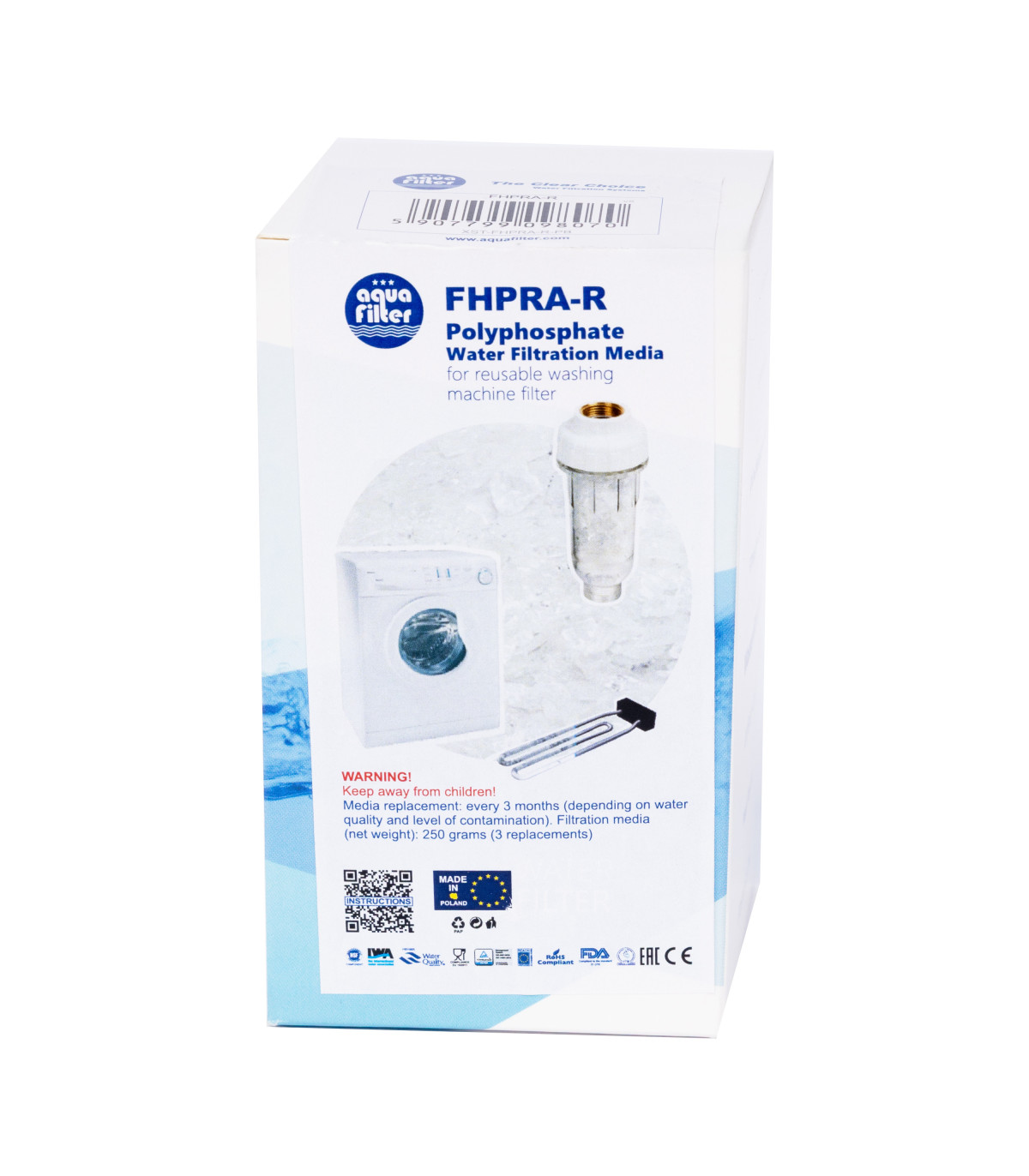 FHPRA-R to złoże poprawiające wodę przeznaczone jako wkład uzupełniający dla filtrów z serii FHPRA. Jego głównym zadaniem jest wspomaganie ochrony urządzeń domowych (pralki, zmywarki) przed osadzaniem się kamienia, poprzez transformację jonów wapnia i magnezu w formy, które nie tworzą twardych osadów.