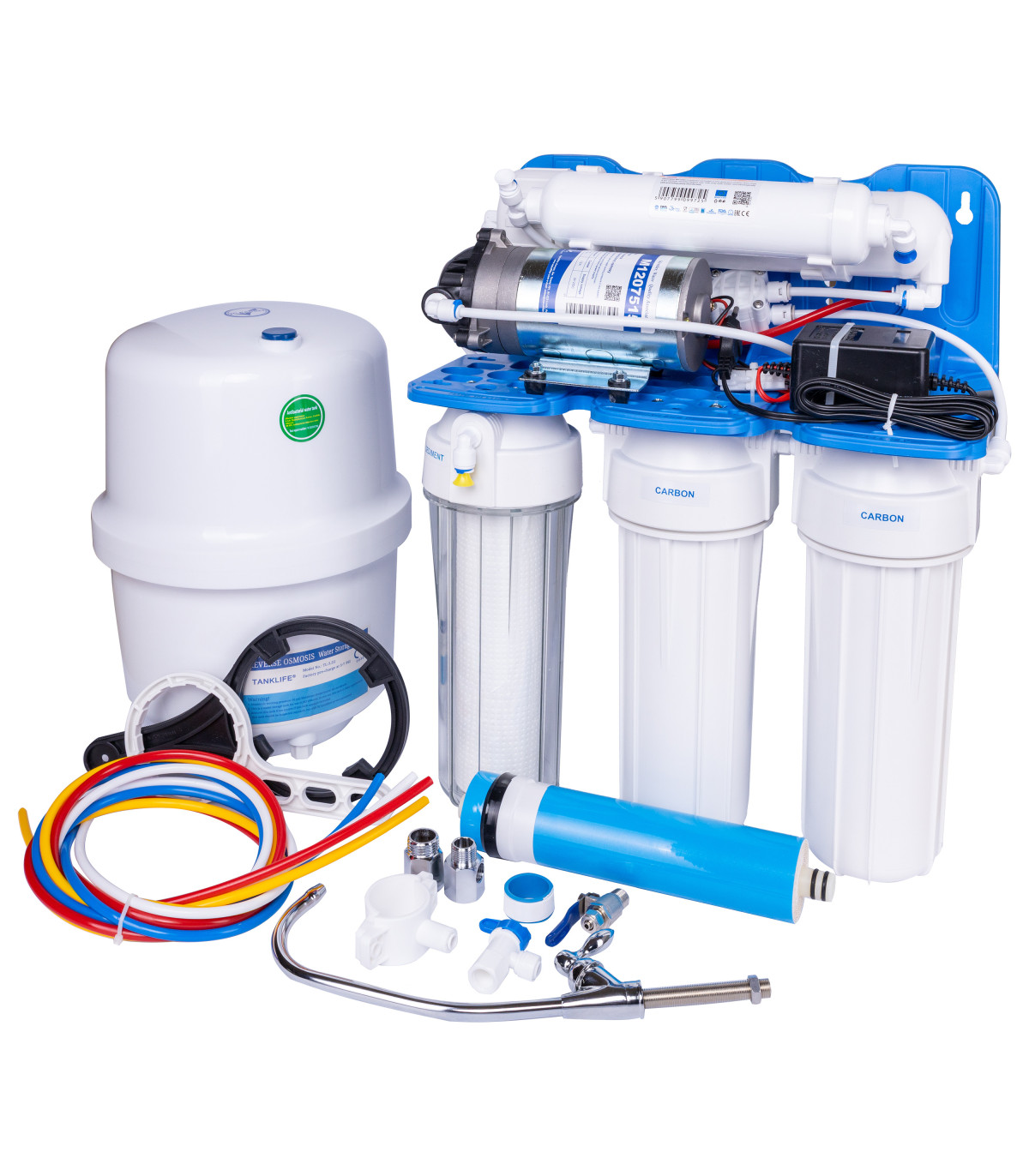 Zaawansowane urządzenie filtracyjne typu podzlewozmywakowego, zaprojektowane z myślą o kompleksowej filtracji wody pitnej w gospodarstwach domowych. Z pompą wspomagającą dla instalacji o niskim ciśnieniu (poniżej 2,8 bar) System wyposażony jest w 5 etapów filtracji, w tym membranę odwróconej osmozy o bardzo drobnym mikronażu, co pozwala usuwać nie tylko zawiesiny i chlor, ale również związki soli, mikroorganizmy, bakterie i wirusy. Zgodnie z danymi producenta wydajność to do 280 l/dzień. Kompletny zestaw zawiera: - wkład sedymentacyjny 5 µm (FCPS5) – etap 1 - wkład węglowy granulowany (FCCA) – etap 2 - blok węglowy (FCCBL) – etap 3 - membrana osmotyczna TFC-75F – etap 4 - wkład post-węglowy (AICRO) – etap 5, poprawiający smak i zapach wody dodatkowo: kranik chromowany, zbiornik ciśnieniowy, przyłącza, wężyki instalacyjne, instrukcja.